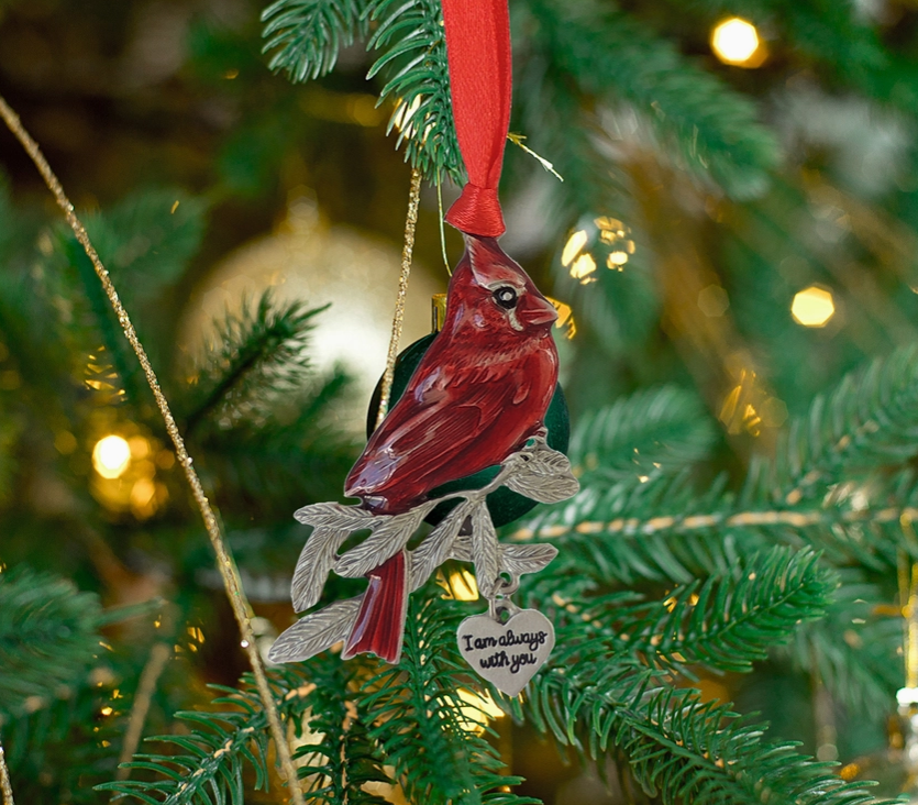 A meaningful memorial sentiment commemorating a lost loved one on your Christmas tree! Cast metal with red epoxy cardinal and cast metal heart charm. 1 ⅞” W x 2 ½” H. Window boxed.